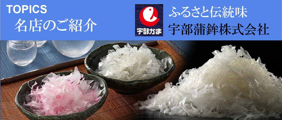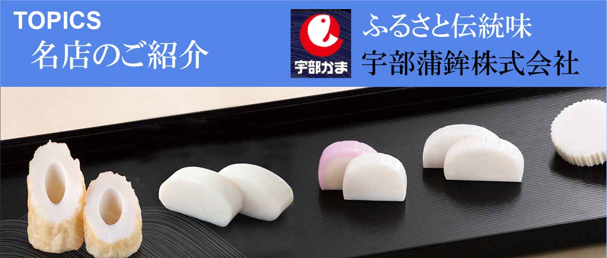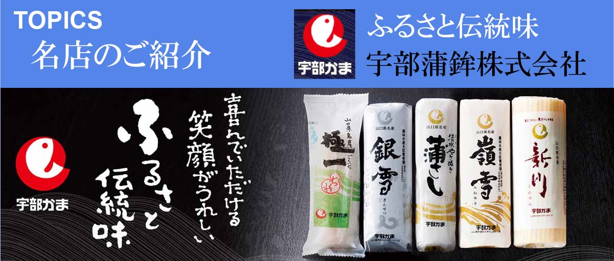 昭和16年に宇部市内の水産練製品業者10店が企業整備令により企業合同し「宇部蒲鉾合同製造販売組合」を設立しました。 昭和24年に社名を現在の「宇部蒲鉾株式会社」に変更しました。平成3年に現在の地に新社屋と新工場を落成依頼現在に至ります。宇部蒲鉾の商品は「新川」「蒲さし」「嶺雪」を三大柱とし、様々な製品を開発し世に送り出してきいます。材料にこだわり、毎年良質の天然エソを仕入れ、水や塩にこだわり、伝統の焼抜きという技術で仕上げています。普段のごはんのおかずや、お酒のおつまみ、また贈答品としても大変喜ばれる商品です。ここでは書ききれませんので宇部蒲鉾さんのホームページでいろいろと詳しくご覧ください。そして是非蒲鉾をご試食ください。