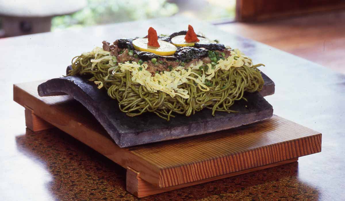 800年の歴史をもつ川棚温泉の名物「瓦そば」は、熱々に熱した瓦の上に炒めた茶そば、牛肉、ねぎ、錦糸玉子、のりなどの具材をのせた、山口県を代表するソウルフードです。 |