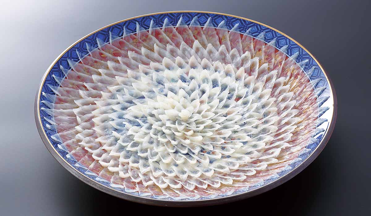 下関で取れるトラフグは盛り付けるお皿の絵柄が見えるほど薄く盛り付けるのがおいしさの秘密。ゆずやスダチをつけ薬味と一緒に召し上がってください。 |